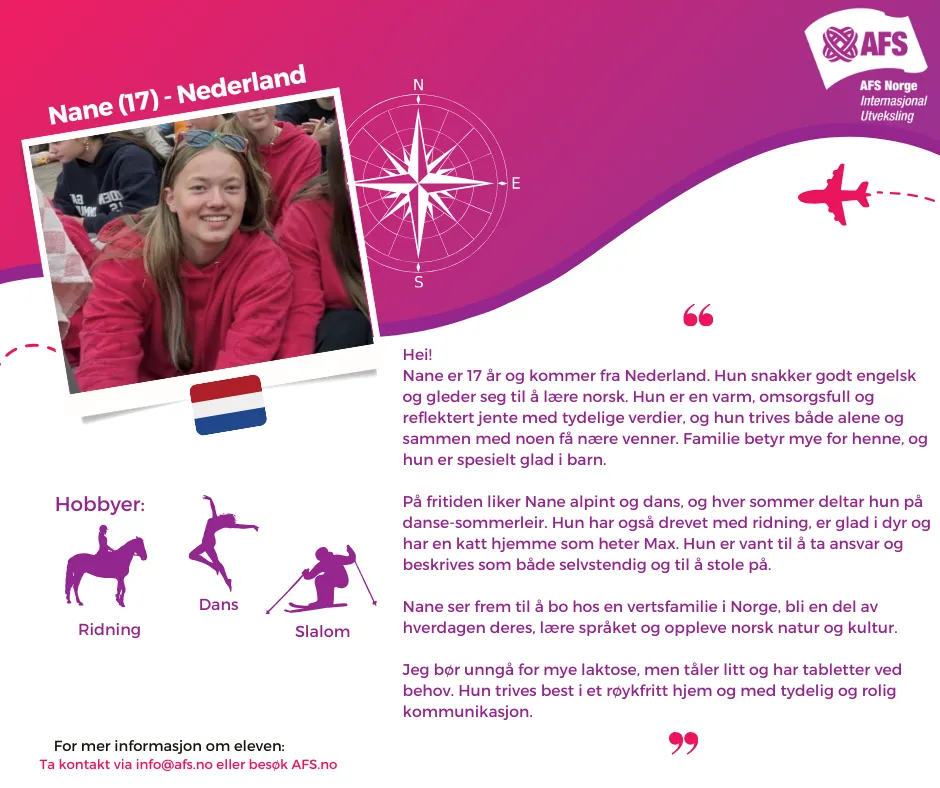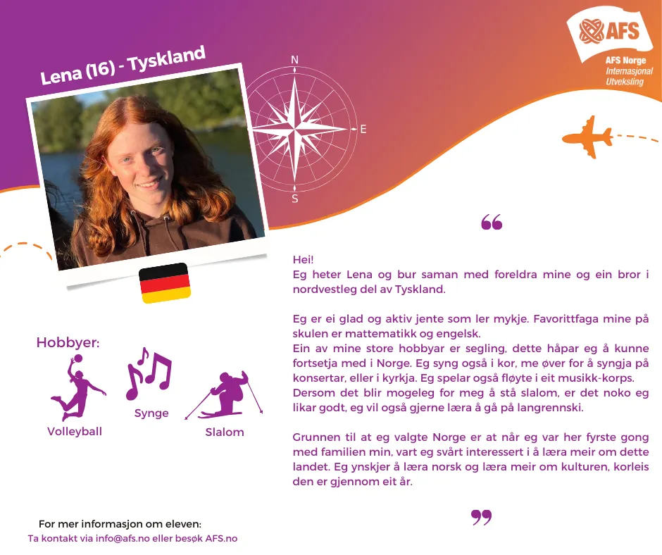 Har dere et ledig rom og har lyst på et spennende år – eller et halvår – sammen med en ungdom fra et annet land? Ikke nøl med å ta kontakt via [email protected] om dere ønsker mer informasjon om en elev!