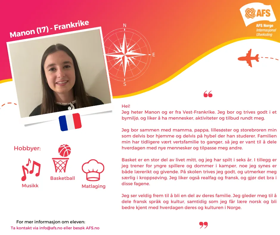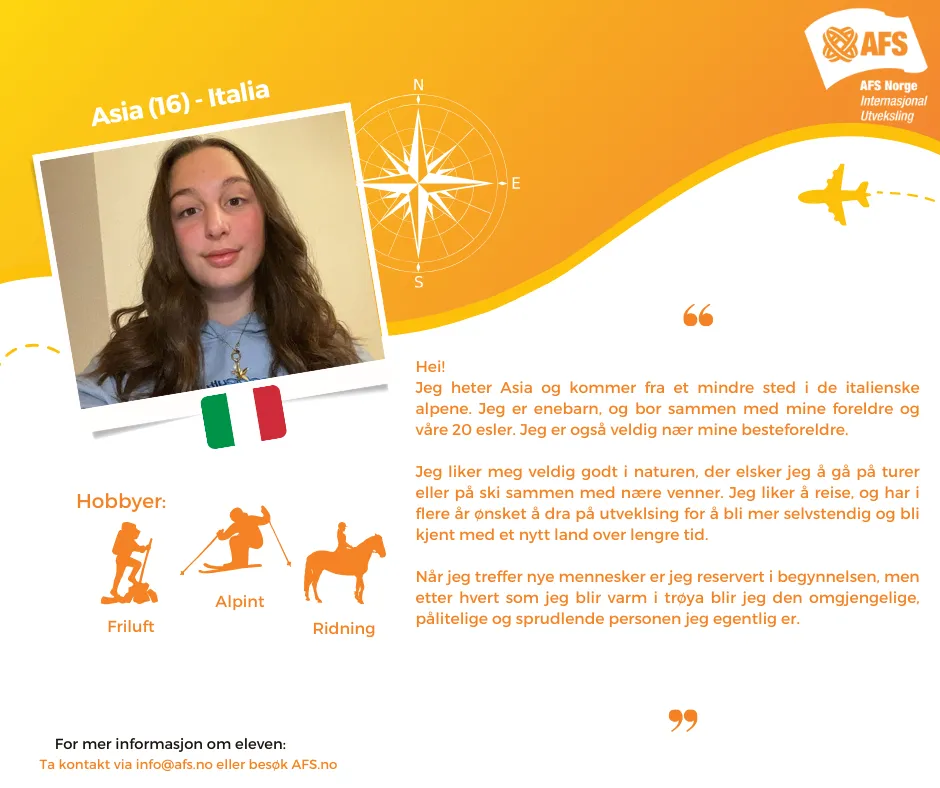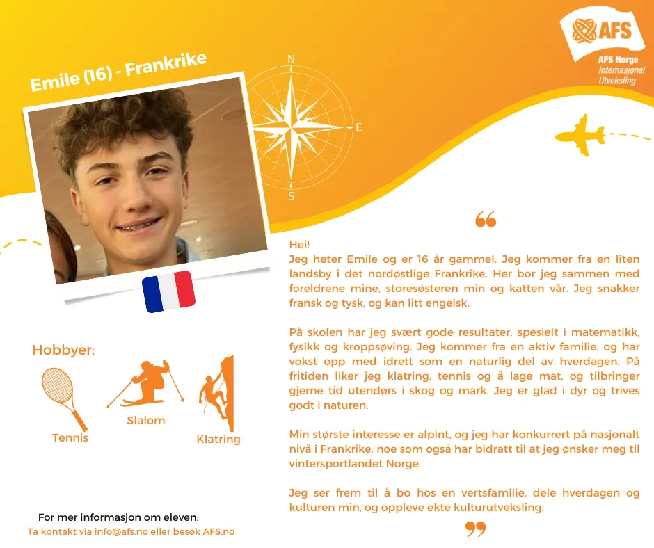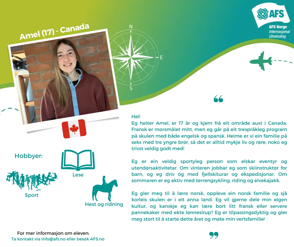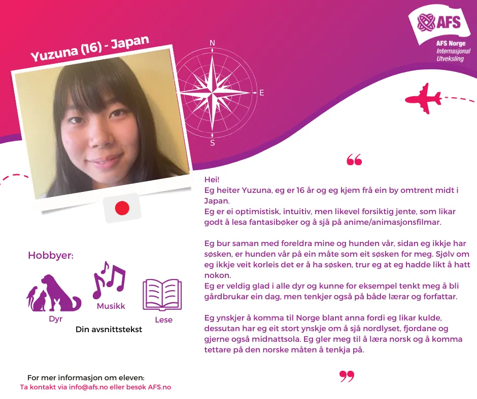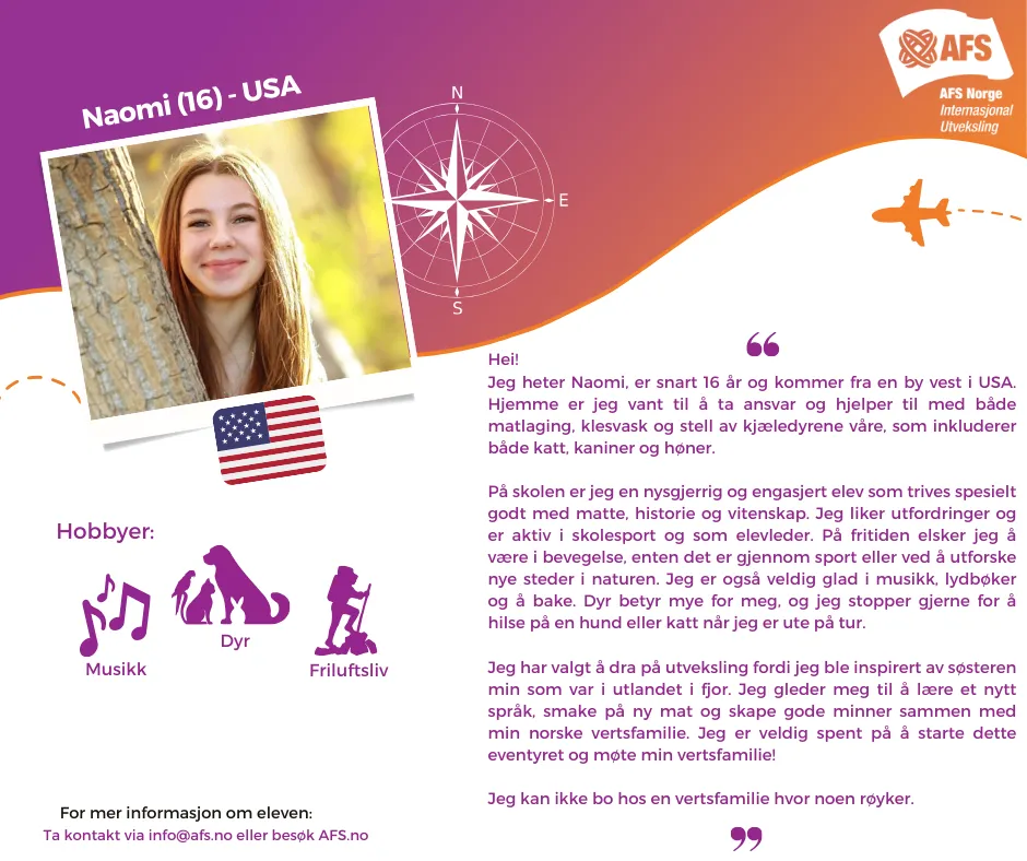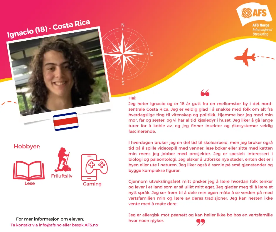 Har dere et ledig rom og har lyst på et spennende år sammen med en ungdom fra et annet land? Ikke nøl med å ta kontakt via [email protected] om dere ønsker mer informasjon om en elev!