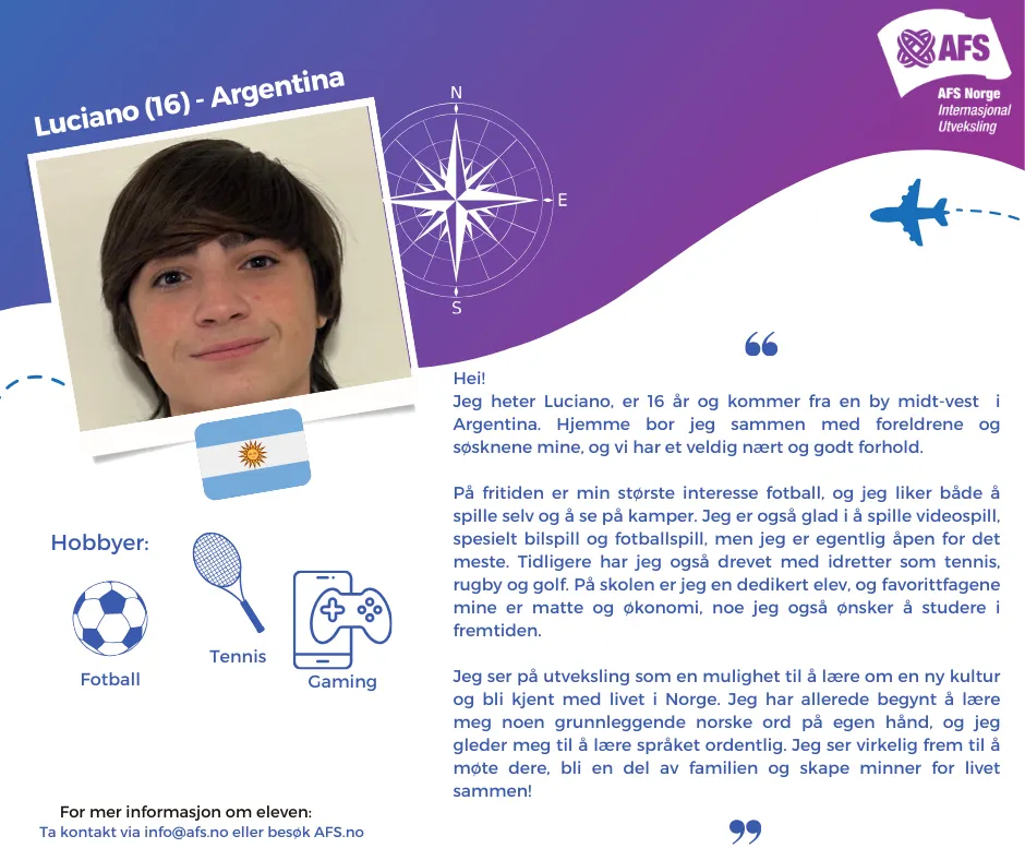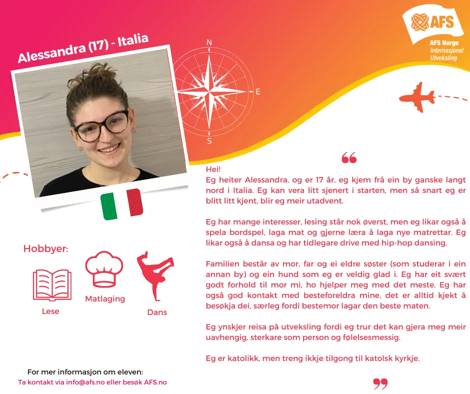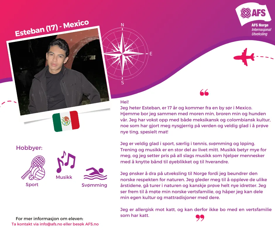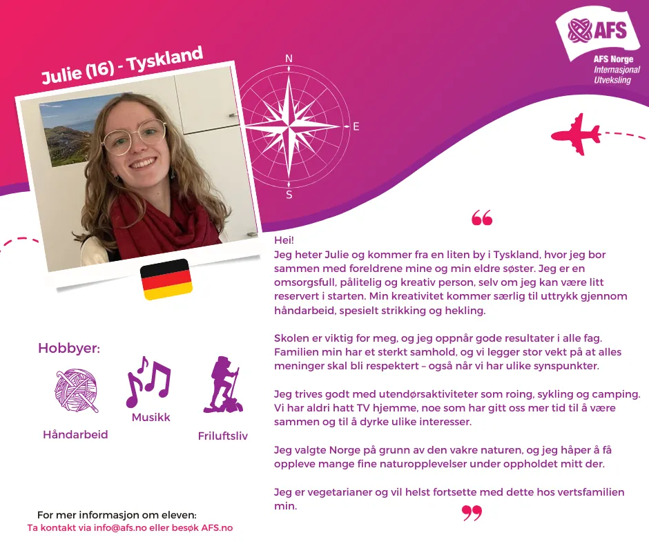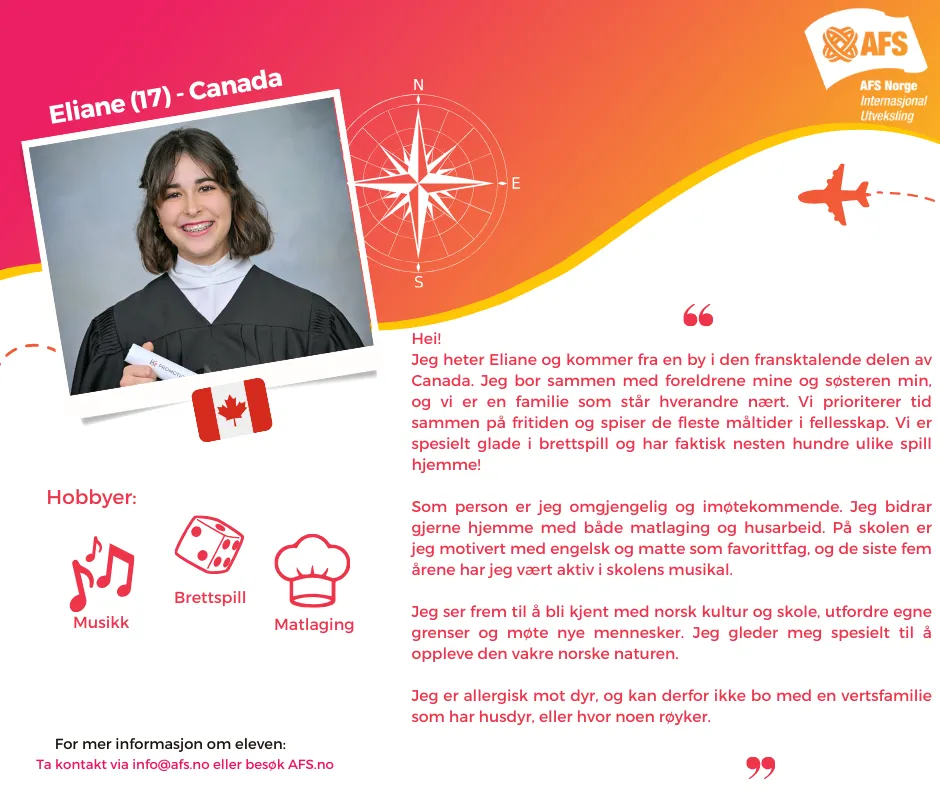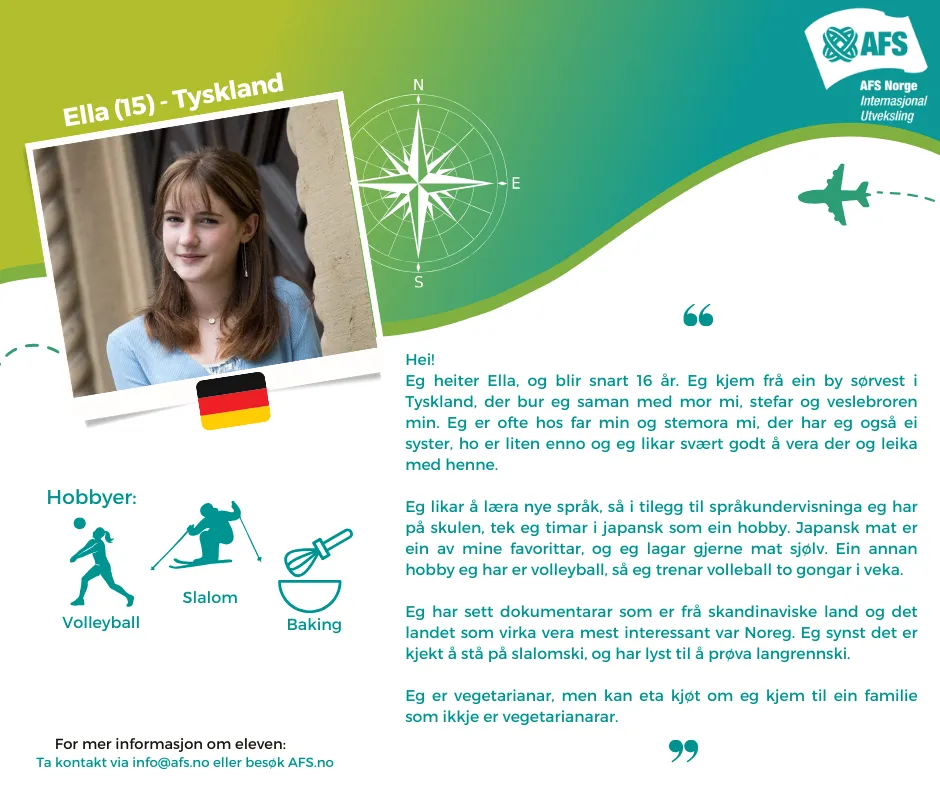 Har dere et ledig rom og har lyst på et spennende år sammen med en ungdom fra et annet land? Ikke nøl med å ta kontakt via [email protected] om dere ønsker mer informasjon om en elev!