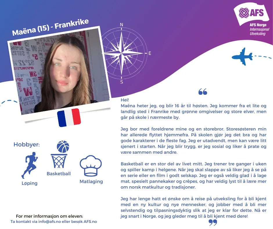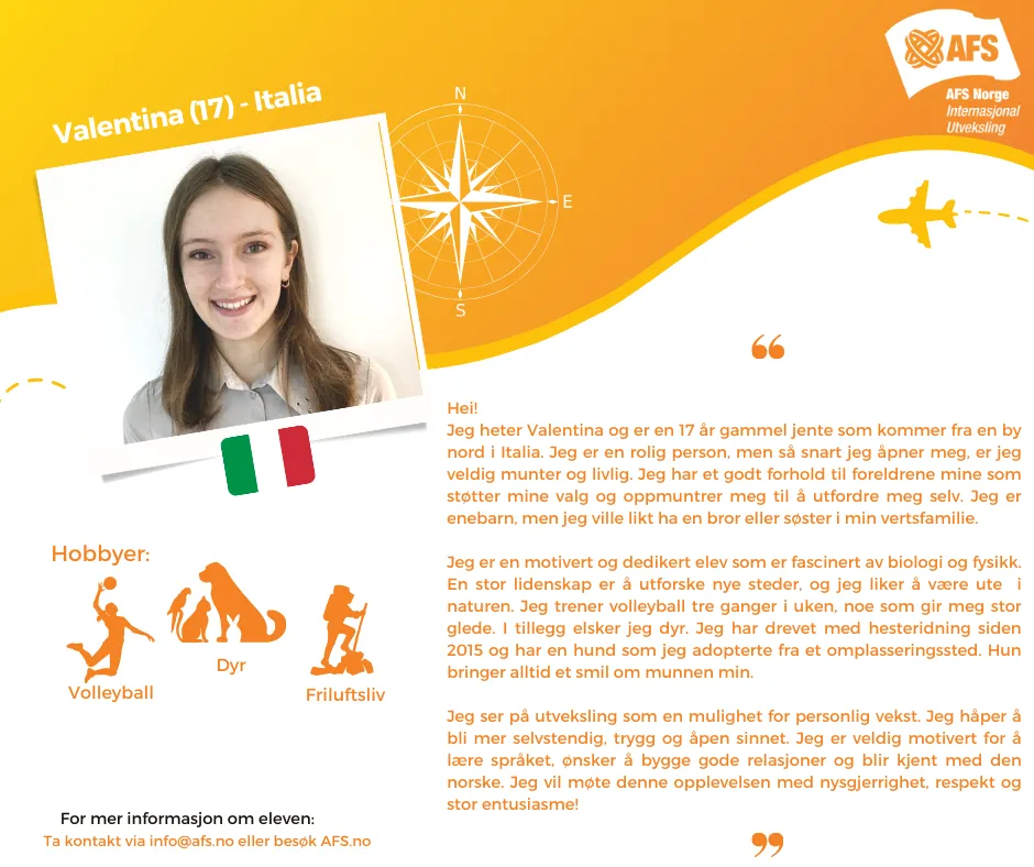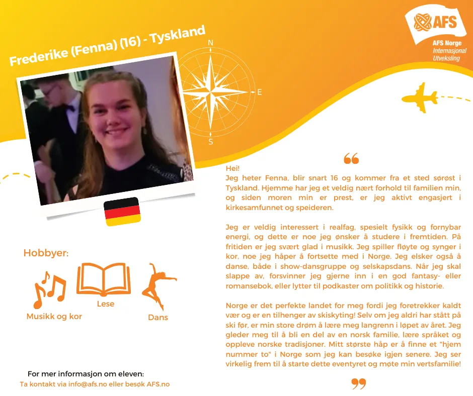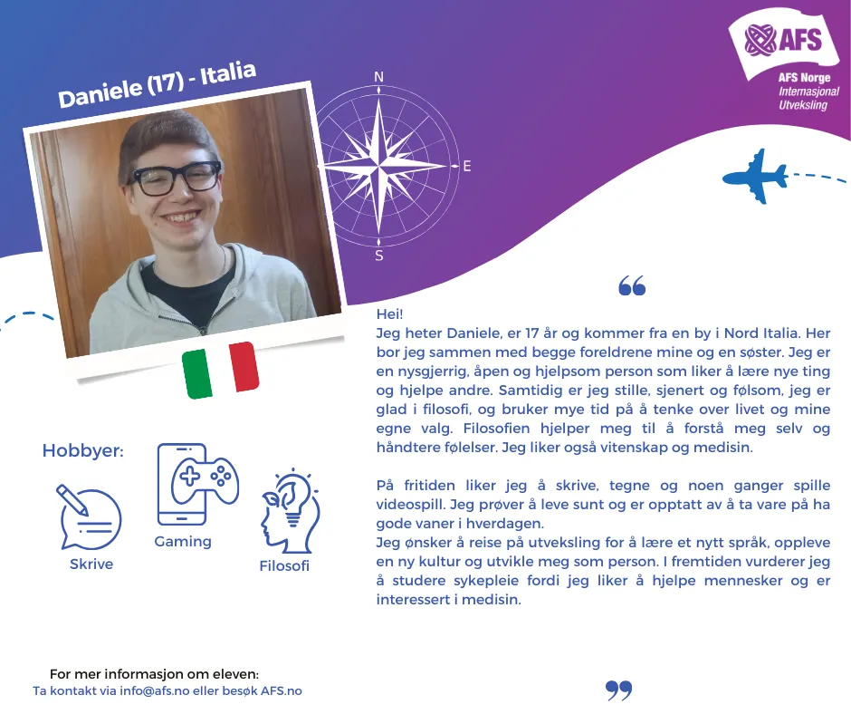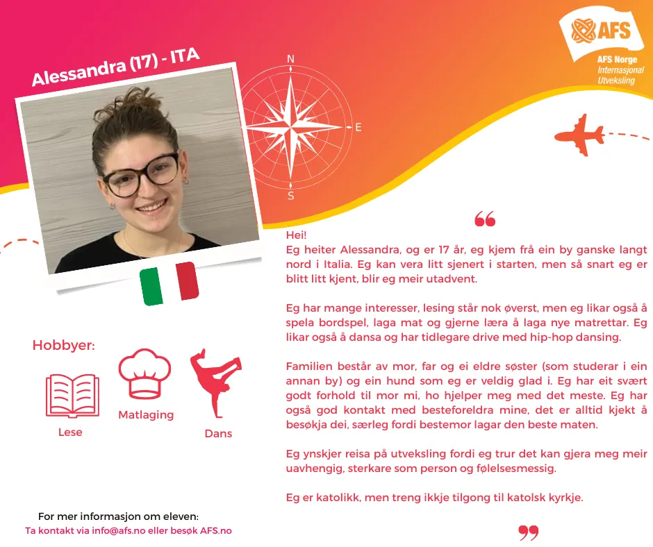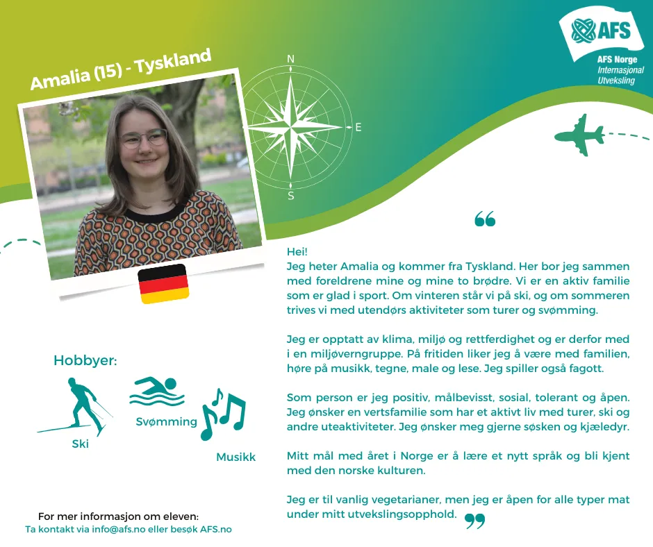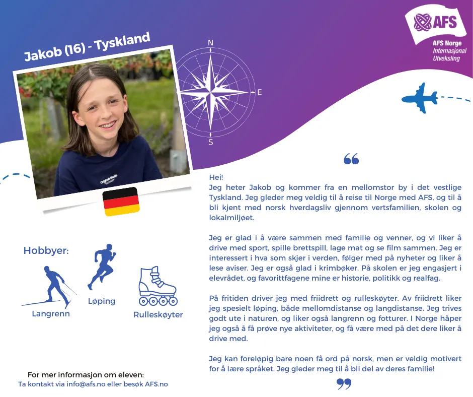 Har dere et ledig rom og har lyst på et spennende år sammen med en ungdom fra et annet land? Ikke nøl med å ta kontakt via [email protected] om dere ønsker mer informasjon om en elev!