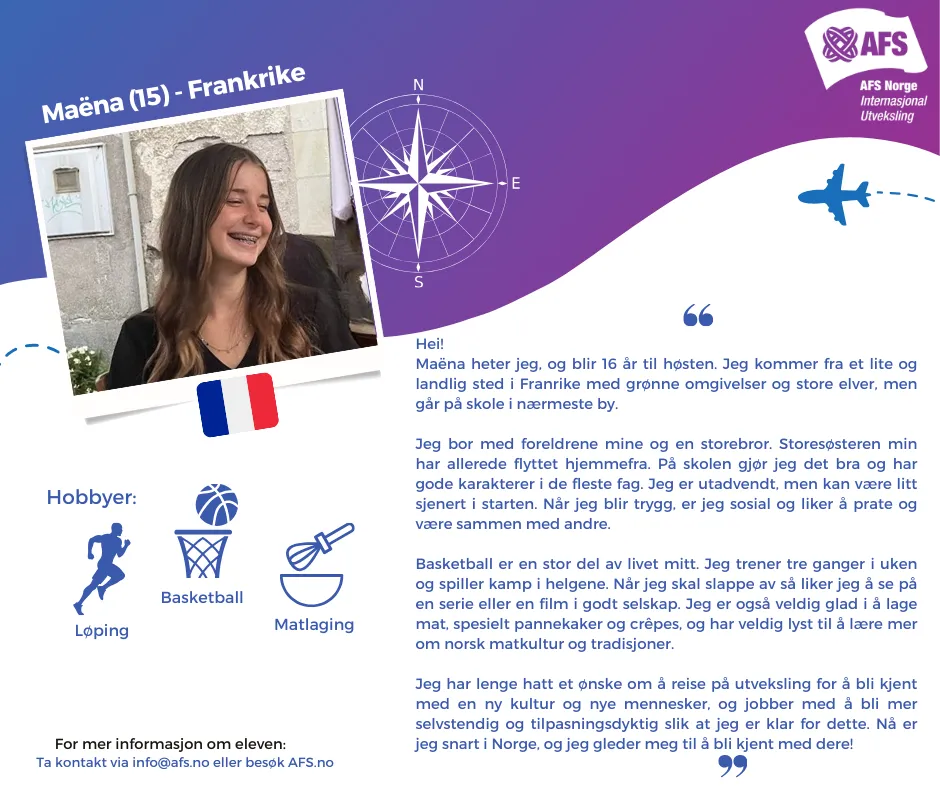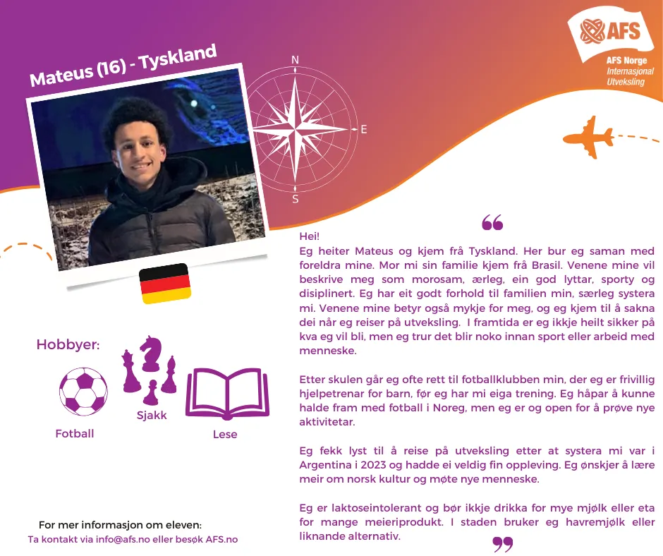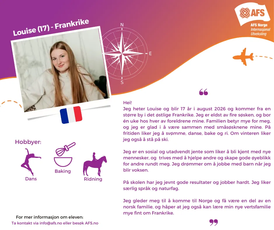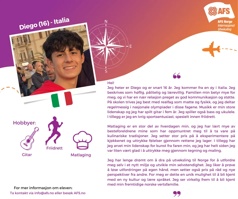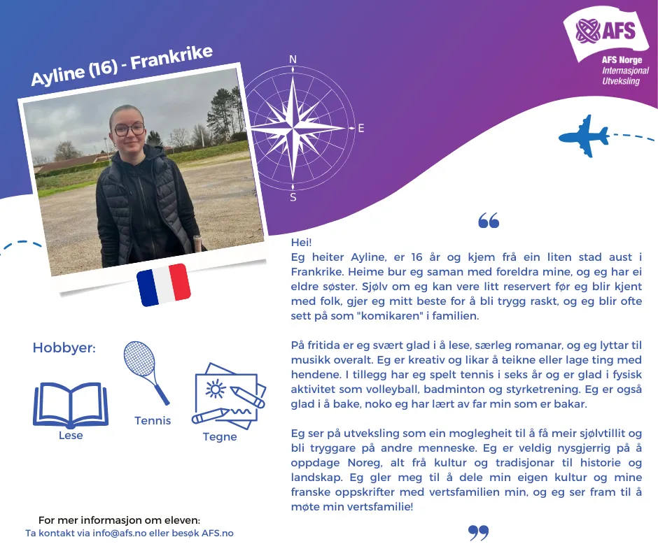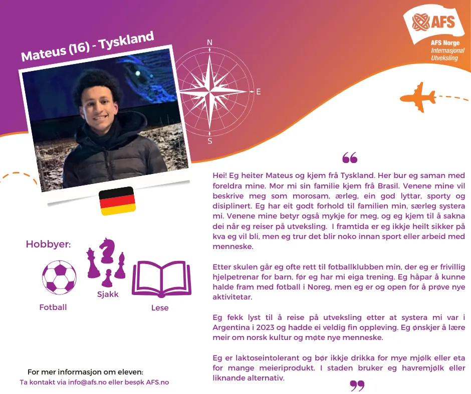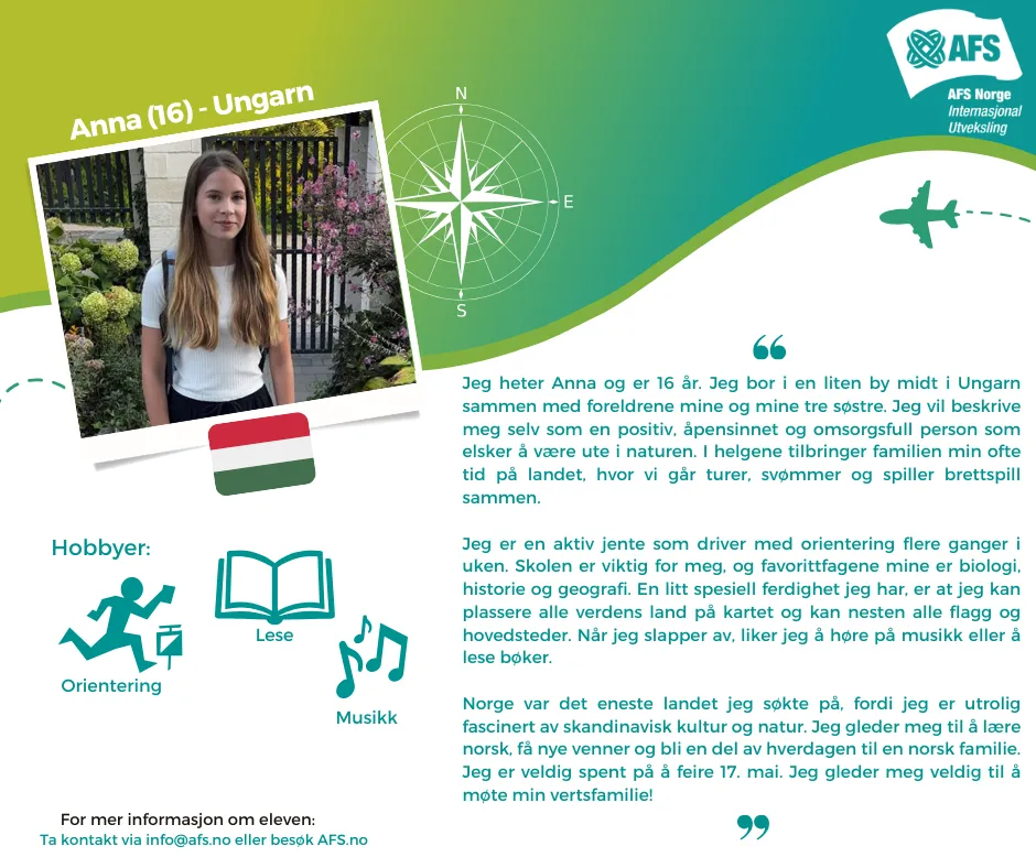 Har dere et ledig rom og har lyst på et spennende år sammen med en ungdom fra et annet land? Ikke nøl med å ta kontakt via [email protected] om dere ønsker mer informasjon om en elev!